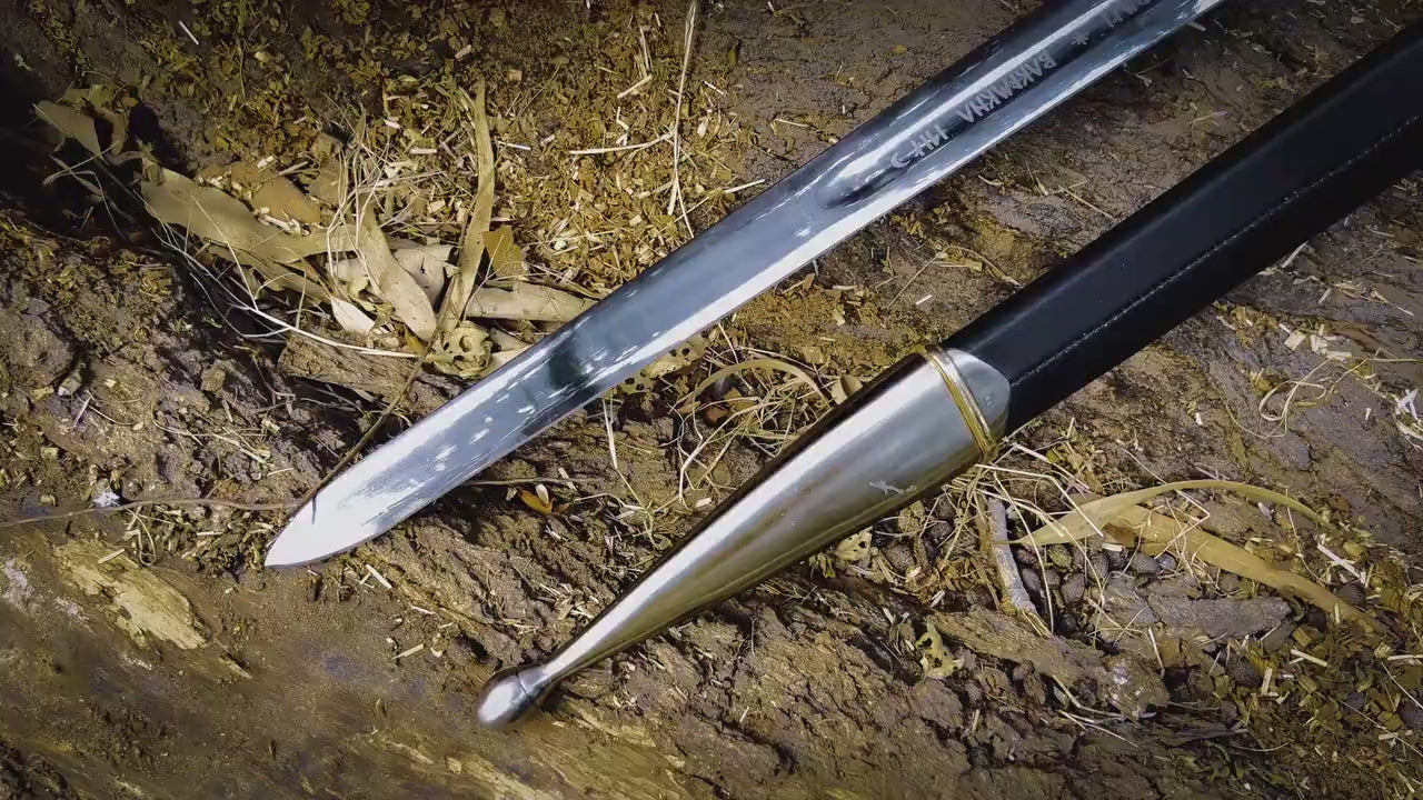 Handle: Solid metal cross guard and pommel, antique metal finish, genuine leather-wrapped grip, rat-tail tang construction
