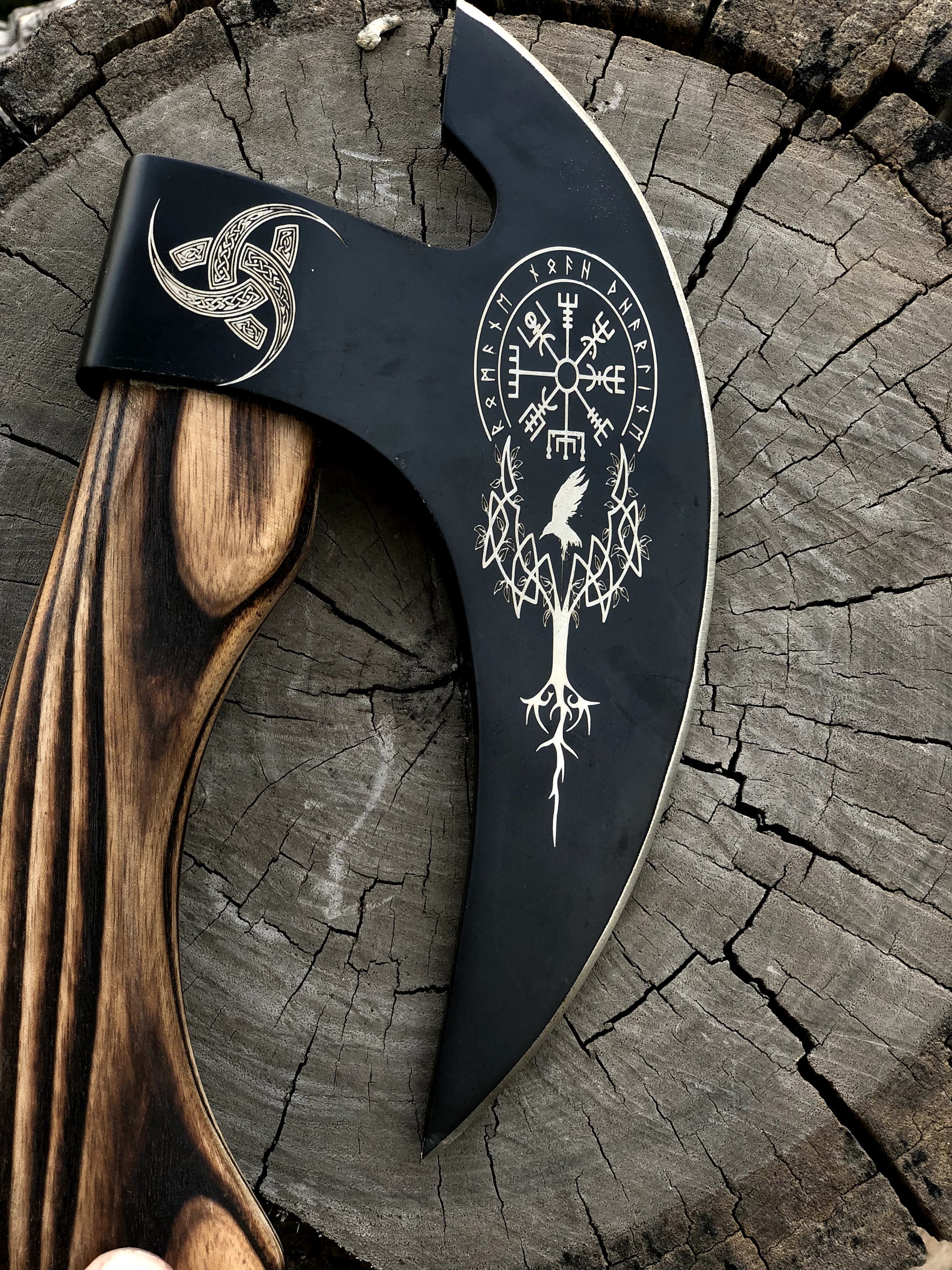 Hand Forged Viking Style Pizza Axe - Dark Skull Etching or Plain in Small or Medium, comes with a leather sheath. A Family and Friend Favorite for all occasions. Viking Pizza Cutter Axe, Viking pizza axe Forged Carbon Steel fist Viking Axe also comes with custom Engraving option. Carving having high quality. It is fully usable tool. We also provide Custom made Axes as well.